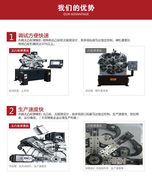 在近幾年無凸輪彈簧機逐漸得到彈簧生產(chǎn)廠家的認(rèn)可。與傳統(tǒng)帶凸輪彈簧機相比,永騰無凸輪彈簧機在設(shè)計上采用獨特