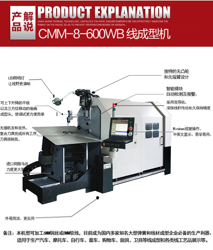 此次參展,東莞永騰自動(dòng)化設(shè)備有限公司帶來的設(shè)備有CMM-8-600WB八軸多功能線材成型機(jī)、CMM-12-236R轉(zhuǎn)線機(jī)、CMM-12-450R轉(zhuǎn)線機(jī),其中CMM-8-600WB八軸多功能線材成型機(jī)為此次展品的重頭戲。本機(jī)全部采用雙導(dǎo)軌滾珠絲桿傳動(dòng),以保證精度和力度。它可以加工4毫米鋼絲或6毫米軟線,目前成為國內(nèi)多家知名大型彈簧和線材成型企業(yè)必備的生產(chǎn)利器。無撞機(jī)發(fā)和發(fā)熱、復(fù)合刀具完成所有工序,刀具損耗低。智能模塊,還可以自動(dòng)檢測(cè)及報(bào)警。Windows視窗操作、中英文顯示、易學(xué)易用。該設(shè)備適用生產(chǎn)汽車,摩托車,自行車,童車,購物車,廚具以及各類線成型工藝品展示架等。