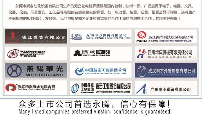 東莞永騰自動(dòng)化設(shè)備有限公司是一家專業(yè)生產(chǎn)CNC多軸多功能無凸輪電腦彈簧機(jī)、線材成型機(jī)的美國獨(dú)資企業(yè)。我公司從2001年開始運(yùn)用美國先進(jìn)的伺服控制技術(shù)進(jìn)行一次具有重要意義的技術(shù)改革,打破傳統(tǒng)的凸輪帶動(dòng)成型模式,成為行業(yè)創(chuàng)新的無凸輪模式兼?zhèn)錂C(jī)械手的彈簧機(jī)??杉庸ぞ€徑0.15-12mm范圍彈簧及線材成型。