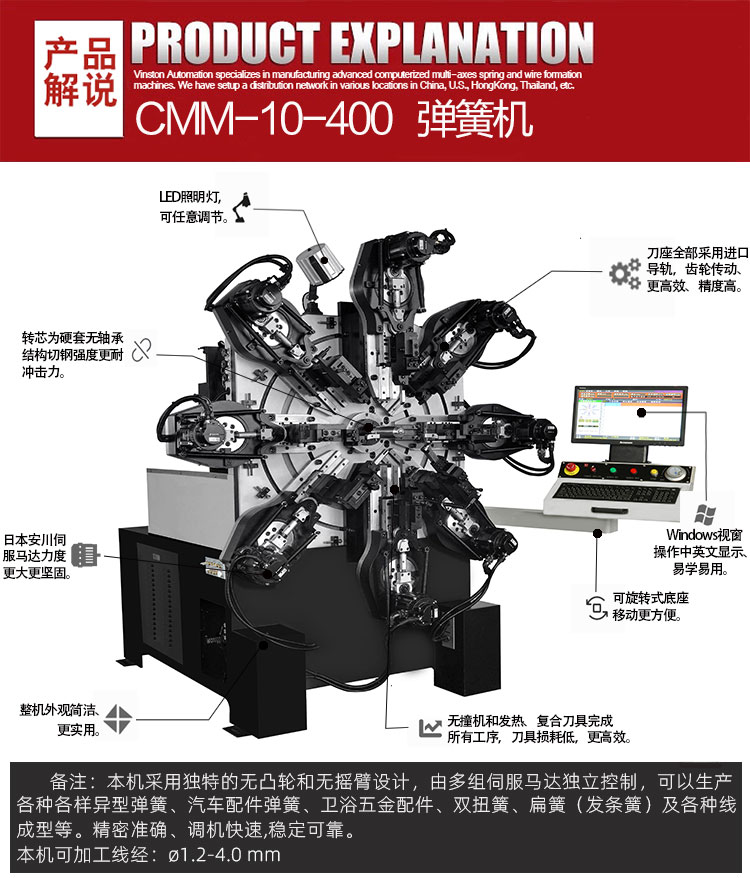 本機(jī)型適用于生產(chǎn)汽車、摩托車、自行車等車輛及娛樂(lè)健身器材所需的高精密彈簧的生產(chǎn)。