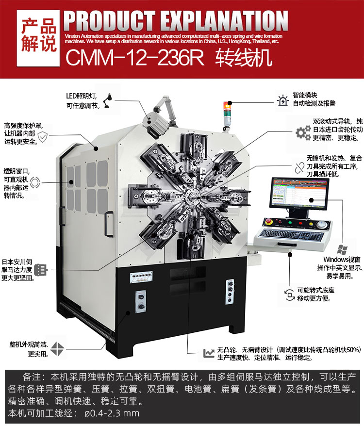 • 產(chǎn)品概述: CMM-12-236R 轉(zhuǎn)線彈簧機(jī).可生產(chǎn)?0.4-2.3 mm線徑彈簧及線成形等)本機(jī)采用獨(dú)特的無(wú)凸輪和無(wú)搖臂設(shè)計(jì),由多組伺服馬達(dá)獨(dú)立控制,可以生產(chǎn)各種各樣異型彈簧、壓簧、拉簧、雙扭簧、電池簧、扁簧(發(fā)條簧)及各種線成型等。精密準(zhǔn)確、調(diào)機(jī)快速、穩(wěn)定可靠。