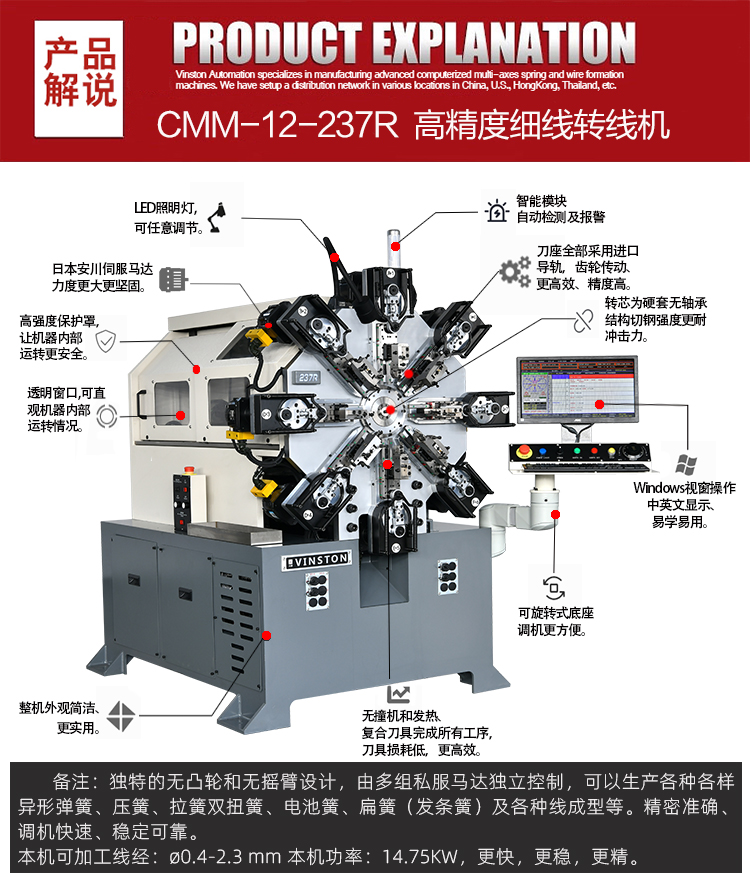 • 產(chǎn)品概述: 永騰最新力作CMM-12-237R 彈簧機.可生產(chǎn)?0.4-2.3 mm線徑彈簧及線成形等)本機采用獨特的無凸輪和無搖臂設(shè)計,由多組伺服馬達獨立控制,可以生產(chǎn)各種各樣異型彈簧、壓簧、拉簧、雙扭簧、電池簧、扁簧(發(fā)條簧)及各種線成型等。精密準(zhǔn)確、調(diào)機快速、穩(wěn)定可靠。