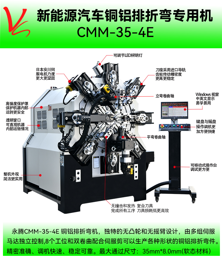• 產(chǎn)品概述: CMM-35-4E銅排折彎機(jī)(最大通過尺寸:35mm*8.0mm)集3D折彎機(jī)和彈簧機(jī)所有的功能于一體的多功能專用機(jī),本機(jī)采用獨(dú)特的無凸輪和無搖臂設(shè)計(jì),由多組伺服馬達(dá)獨(dú)立控制,永騰銅排折彎機(jī)廣泛應(yīng)用于導(dǎo)電排成型,新能源電池連接排、新能源電池模組、銅母排成型、硬排成型、導(dǎo)電排、電池連接排、銅排、裸排成型等。精密準(zhǔn)確、調(diào)機(jī)快速、穩(wěn)定可靠。